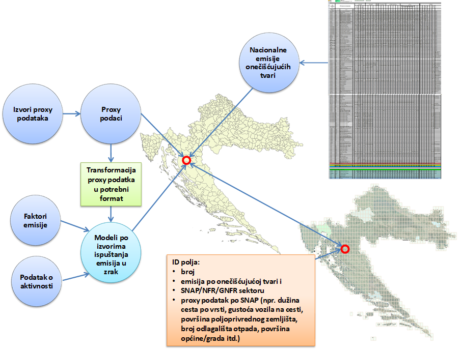 Slika 10.2-1 Pojednostavljeni prikaz metodologije za prostorno raščlanjivanje emisija onečišćujućih tvari u zrak na području Republike Hrvatske