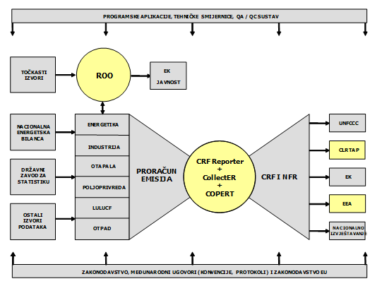 Ministarstvo gospodarstva i održivog razvoja[5] (dalje u tekstu: MINGOR) je, sukladno Zakonu o zaštiti zraka (NN 127/19) i Uredbi o nacionalnim obvezama smanjenja emisija određenih onečišćujućih tvari u zraku u Republici Hrvatskoj (NN 76/18)[6] (dalje u tekstu: Uredba NEC), nadležno tijelo za osiguravanje poslova izrade nacionalnih inventara, godišnjih inventara emisija, projekcija emisija, prostorno raščlanjenih inventara, inventara velikih točkastih izvora, prilagođenih inventara emisija po potrebi i informativnih izvješća o inventaru emisija, a provode ih ovlaštenici sukladno zakonu kojim se uređuje zaštita okoliša.